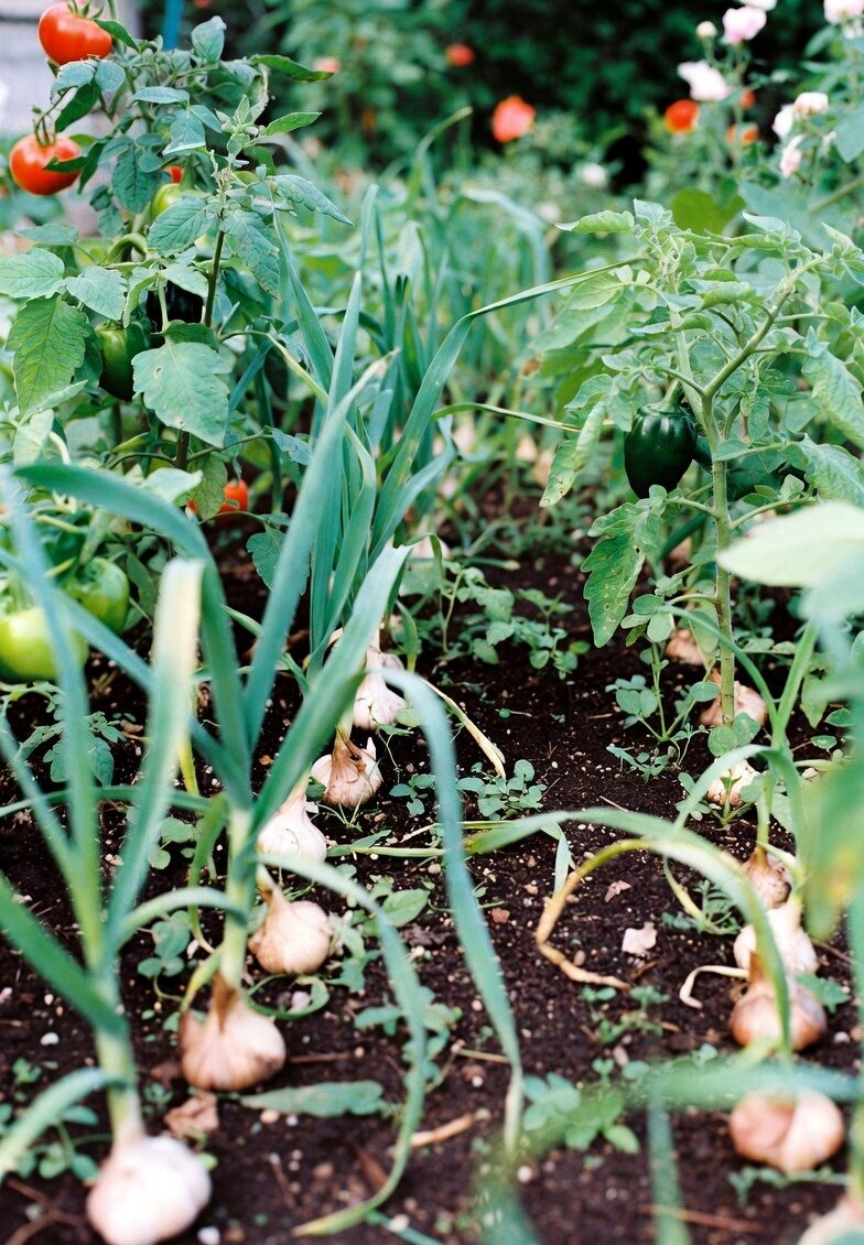 • Mixed beds: Garlic + marigolds + spinach + peppers